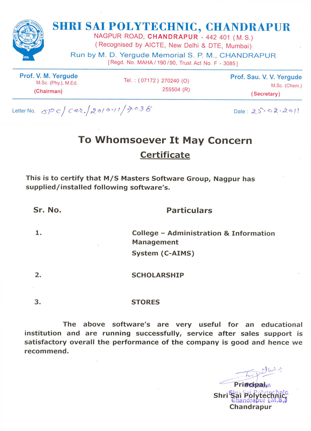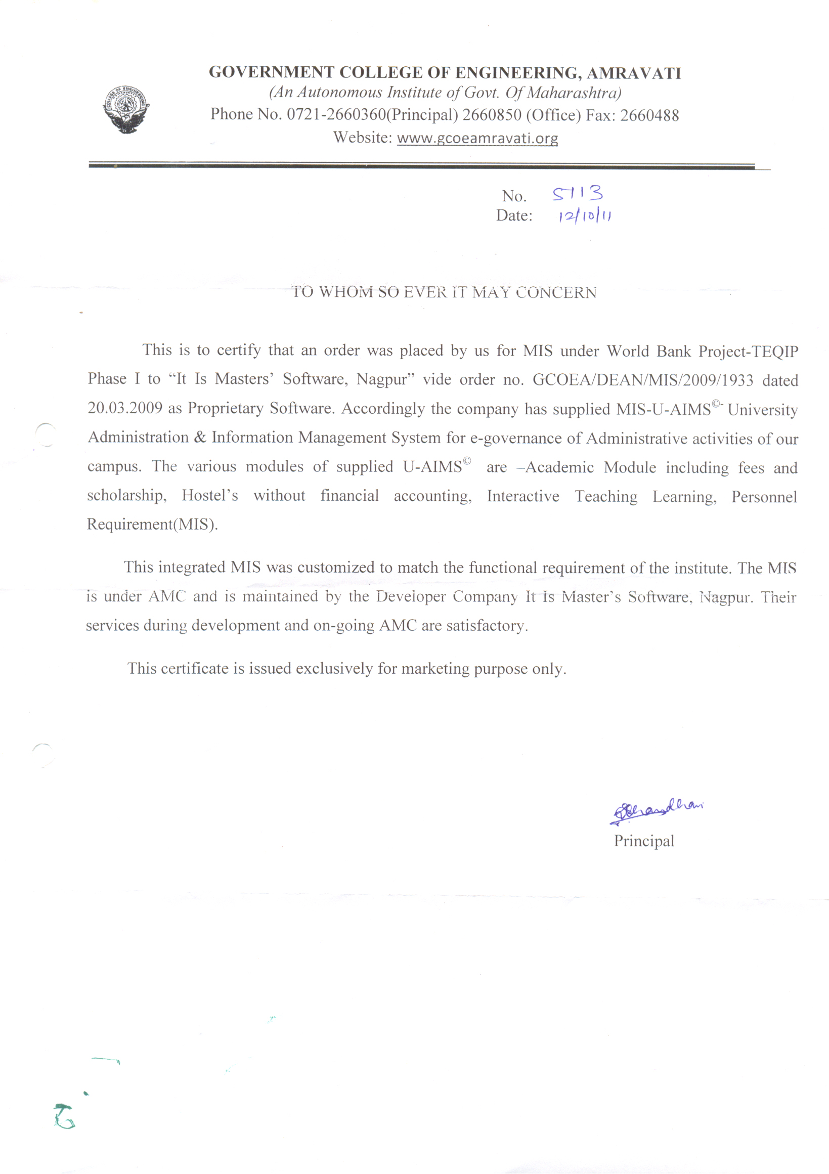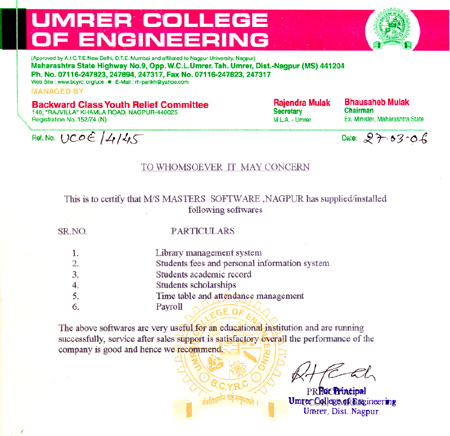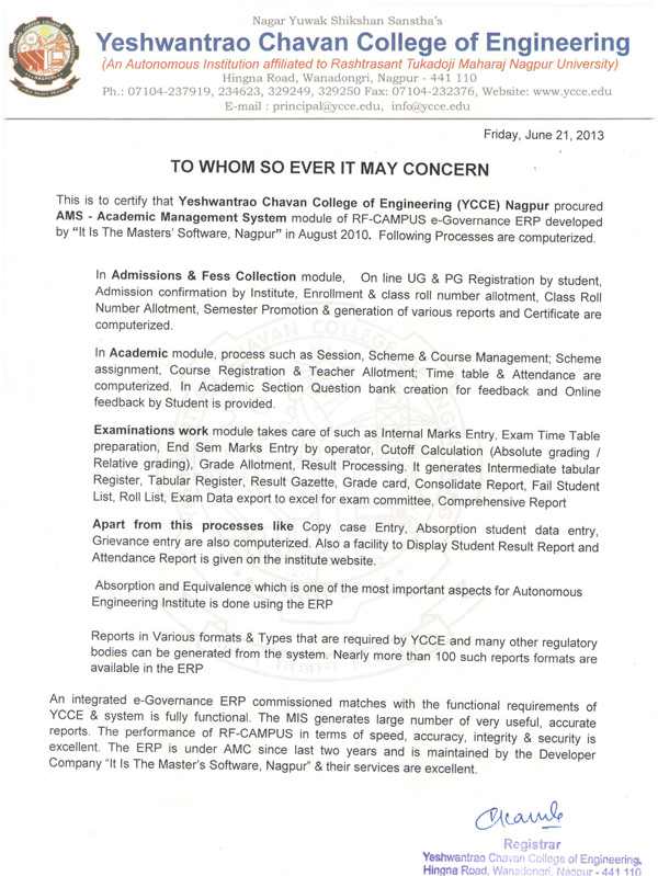 An integrated E-Governance ERP comissioned matches with the functional requirements of YCCE & system is fully functional. The ERP is under AMC since last two years & is maintained by the developer company 'It Is The Master's Software, Nagpur' and their services are excellent.