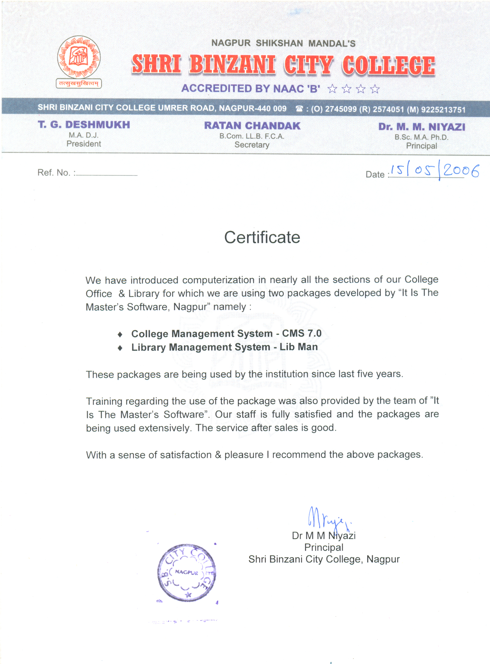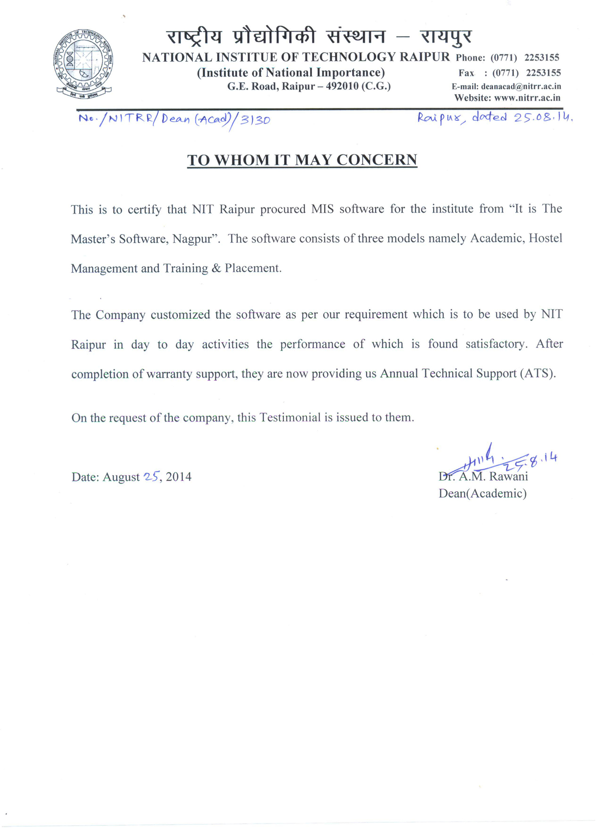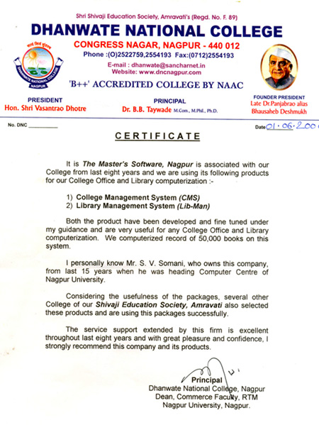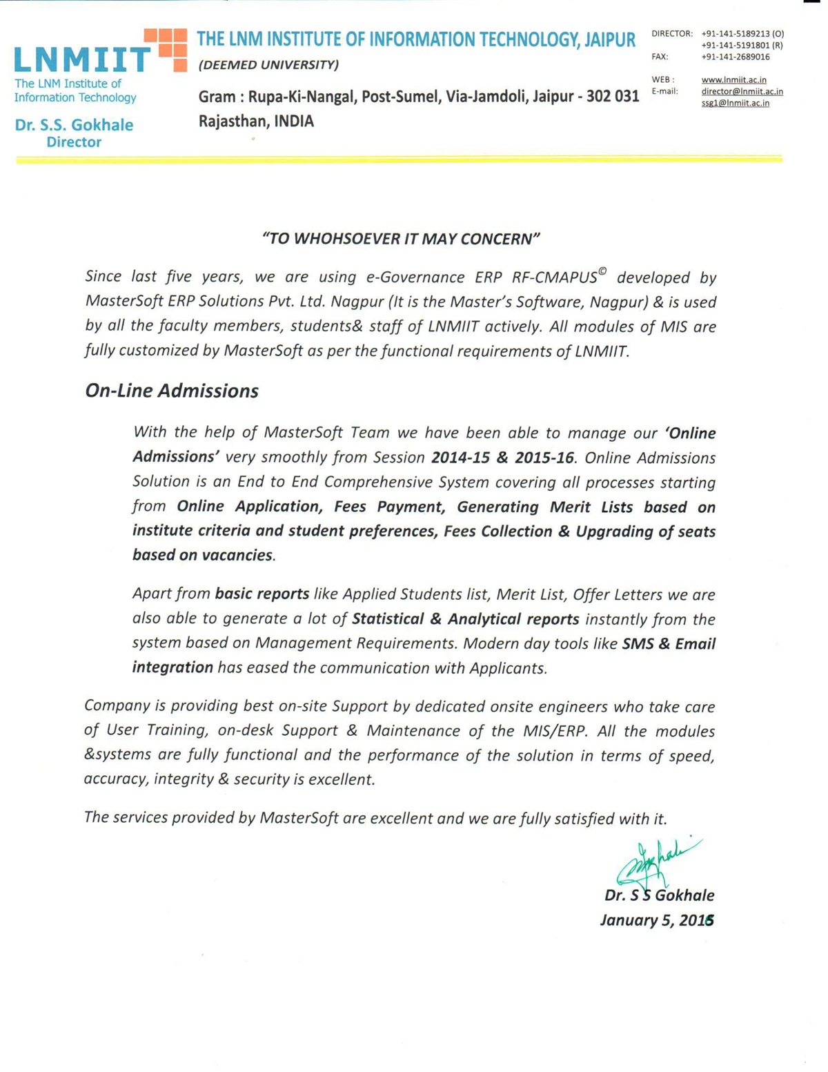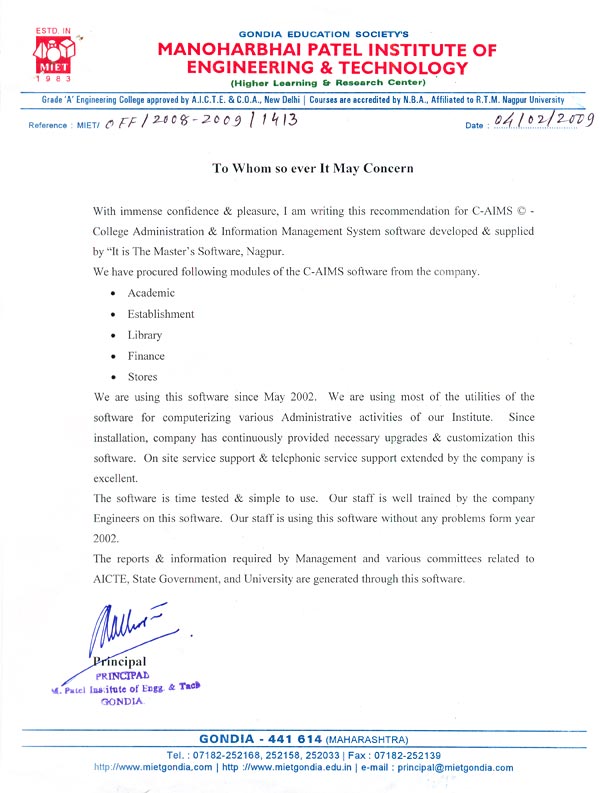 The integrated MIS was customized to match the functional requirement fo the institute. The MIS is under AMC & is maintained by the developer company It is the Master's Software, Nagpur. Their services during development & on-going AMC are satisfactory.