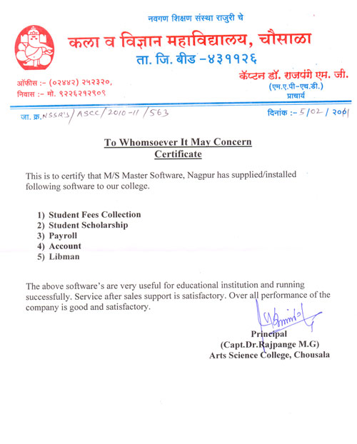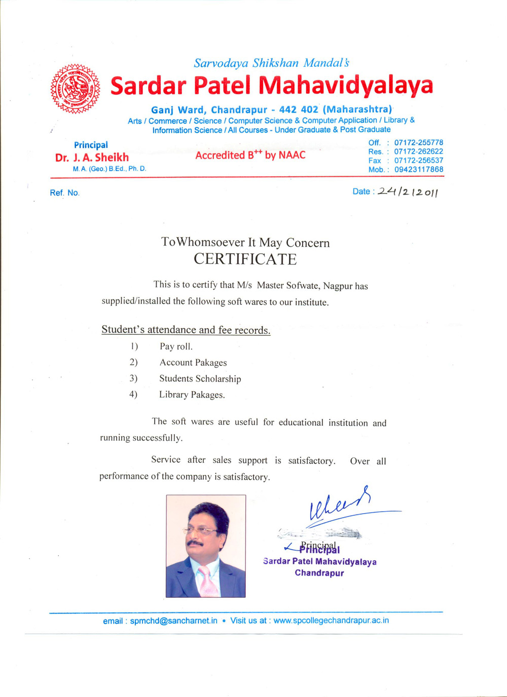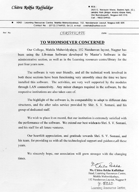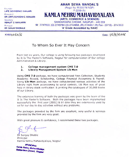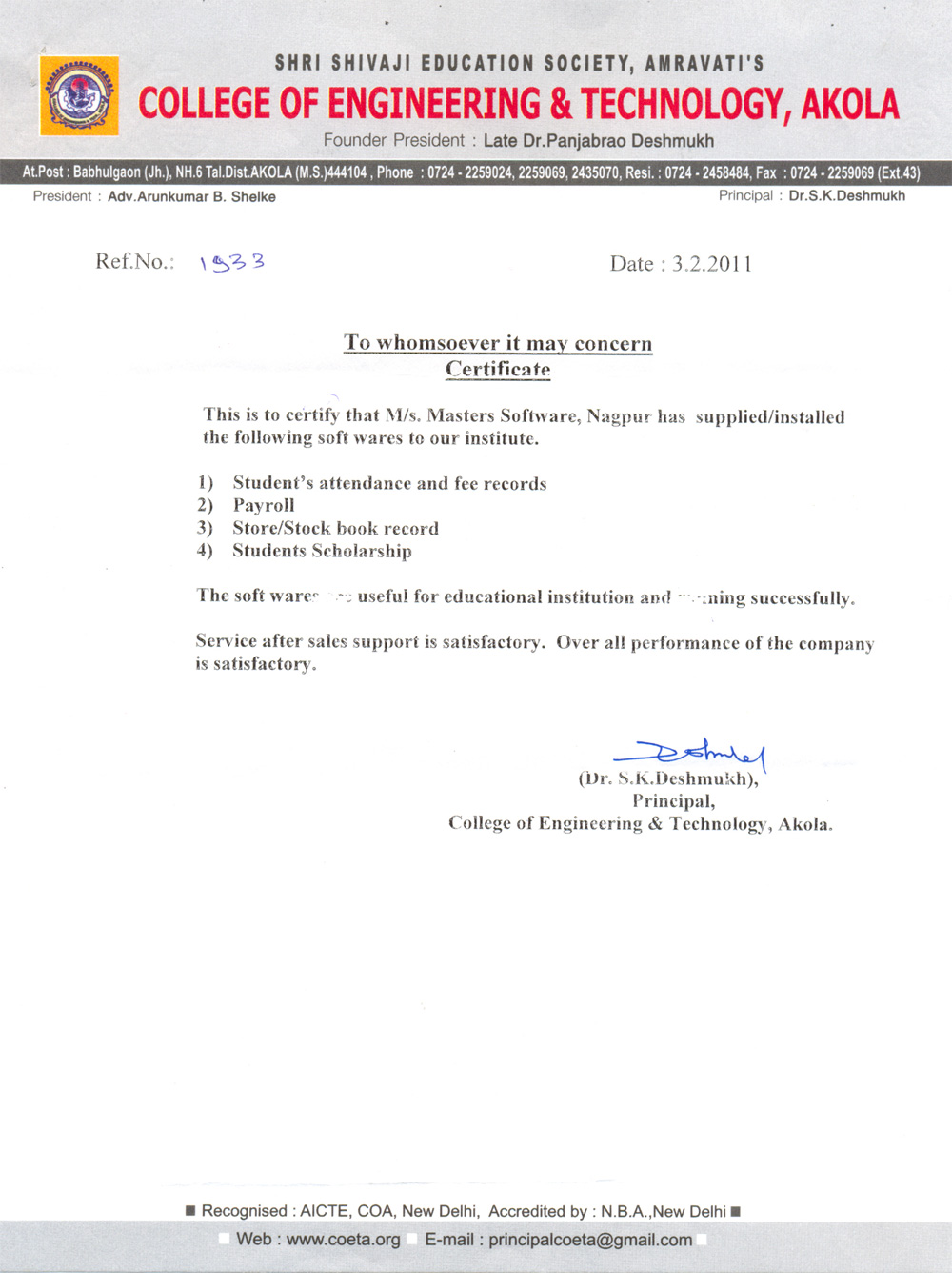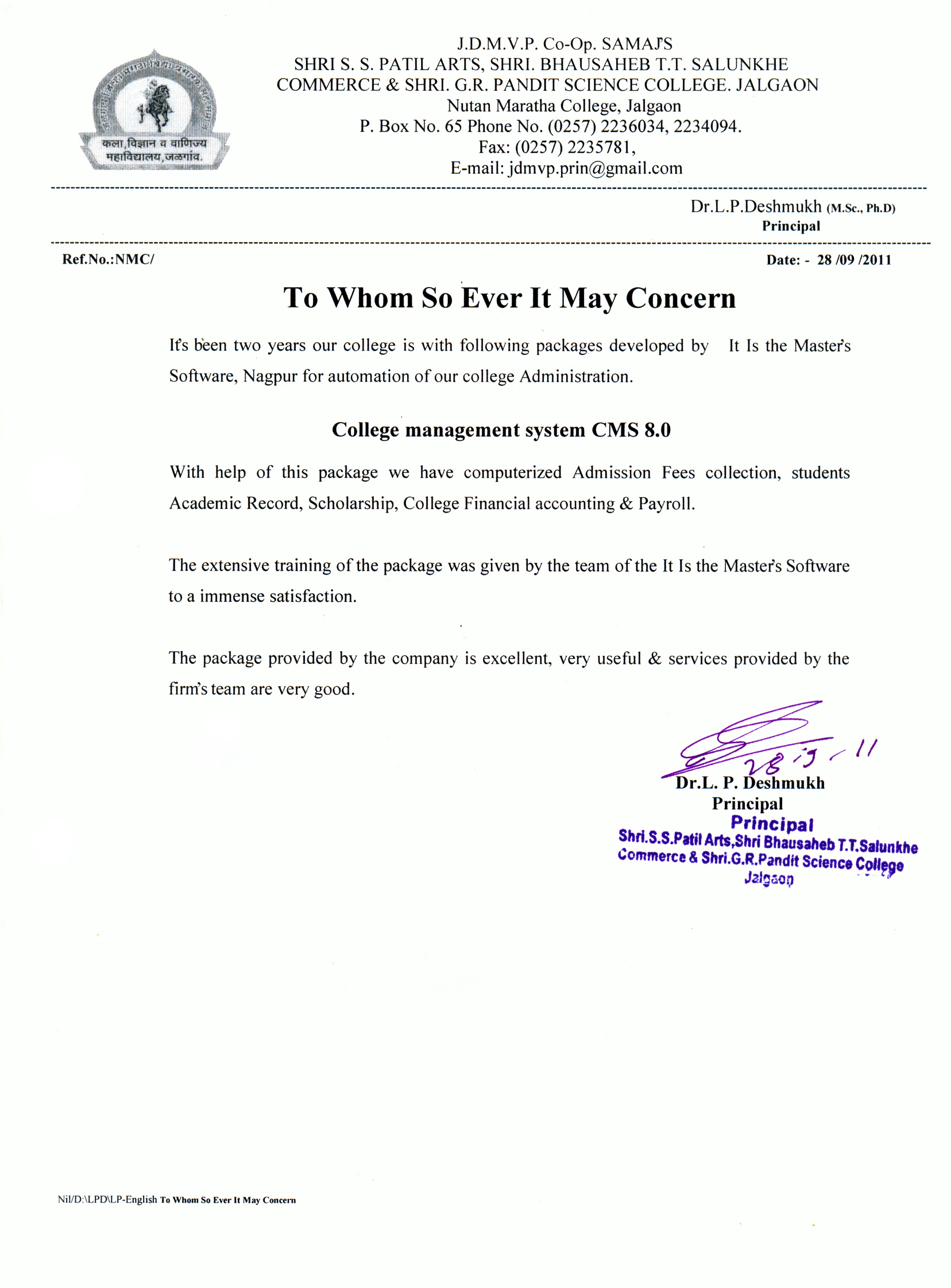 The integrated MIS was customized to match the functional requirement fo the institute. The MIS is under AMC & is maintained by the developer company It is the Master's Software, Nagpur. Their services during development & on-going AMC are satisfactory.