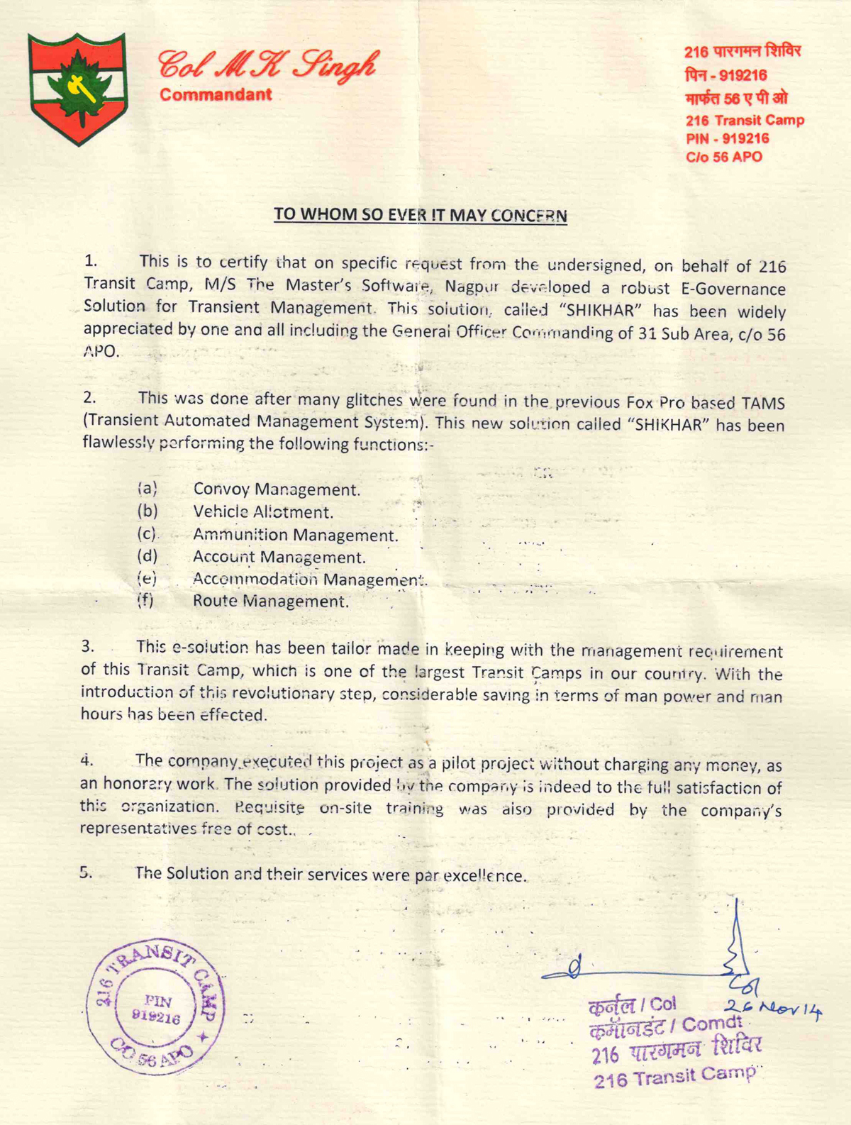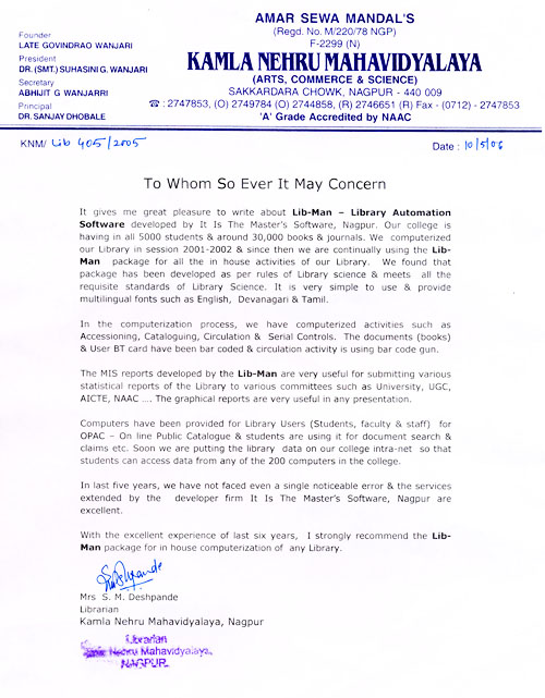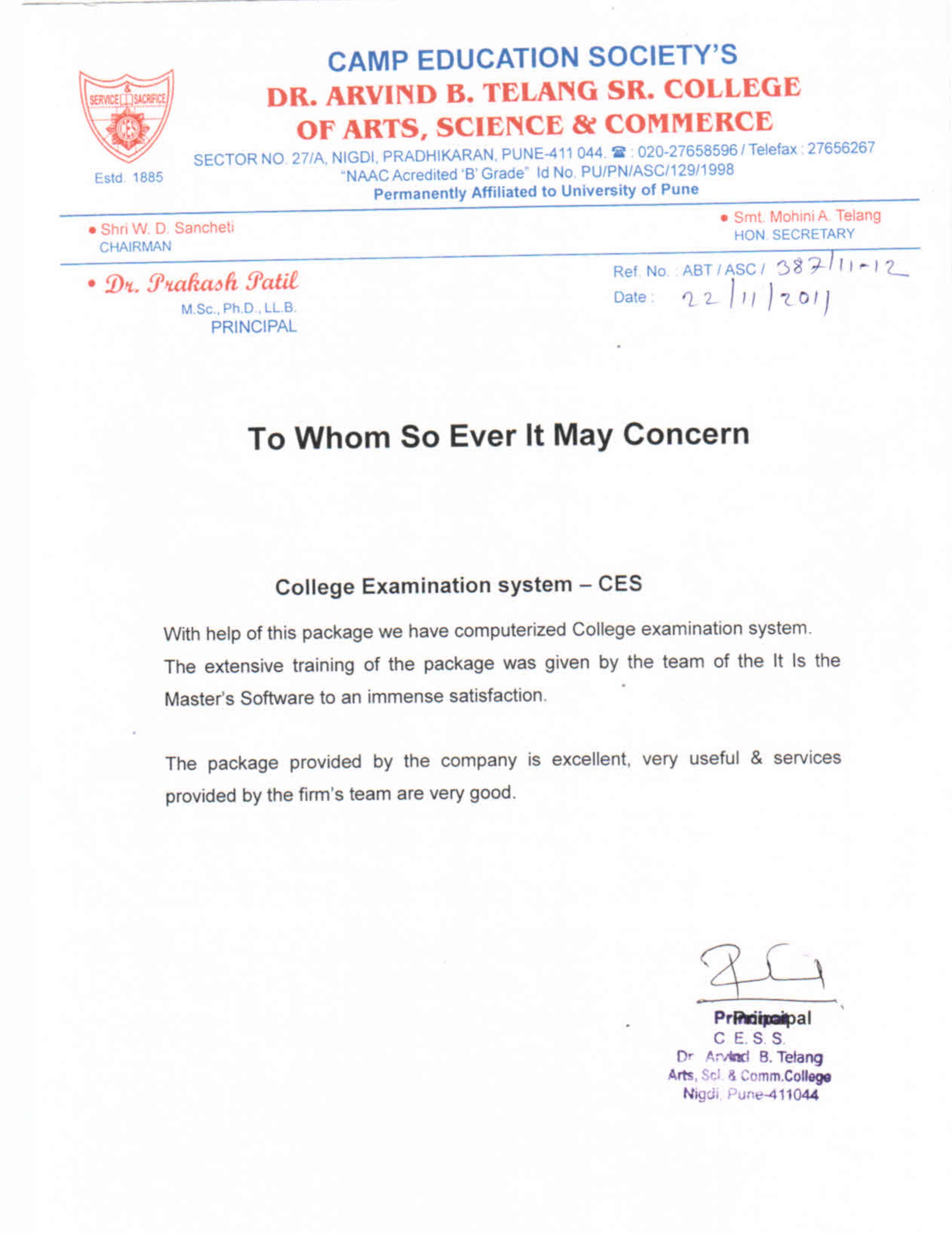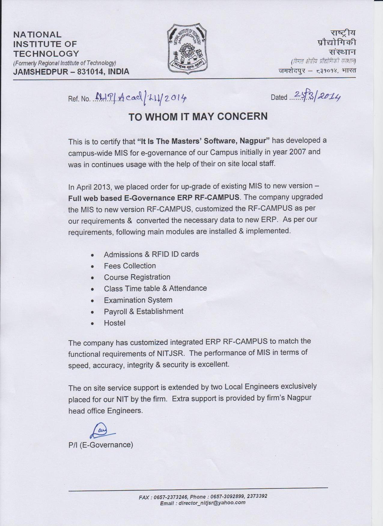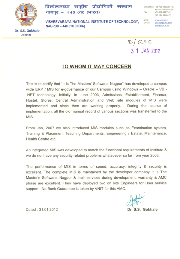 The performance of MIS in terms of speed accuracy, integrity & security is excellent. The complete MIS is maintained by developer company It Is The Master's Software, Nagpur and their services during the development, warranty & AMC phase are excellent. They have deployed two on site engineers for user service support.