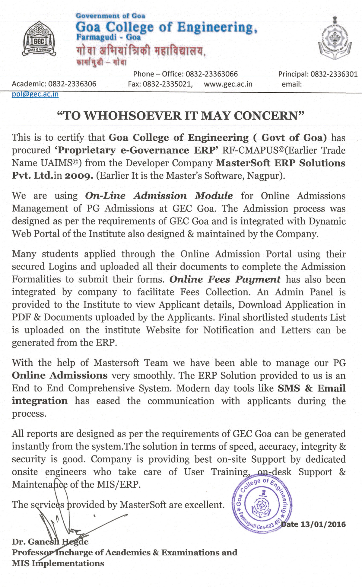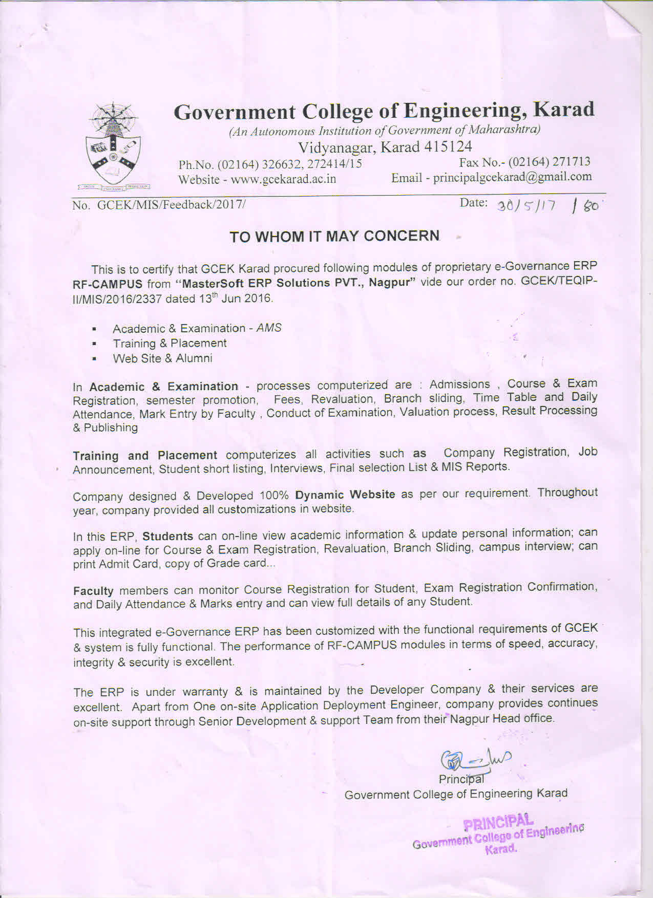 The e-Governance ERP has been customized with functional requirements of GCEK & system is fully functional. The performance of RF-CAMPUS modules in terms of speed, accuracy, integrity & security is excellent. The ERP is under warranty & is maintained by the developer & their services are excellent.