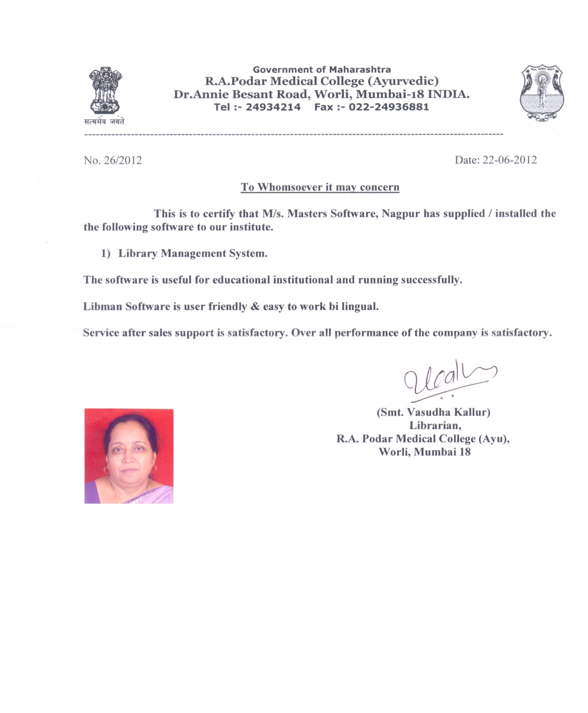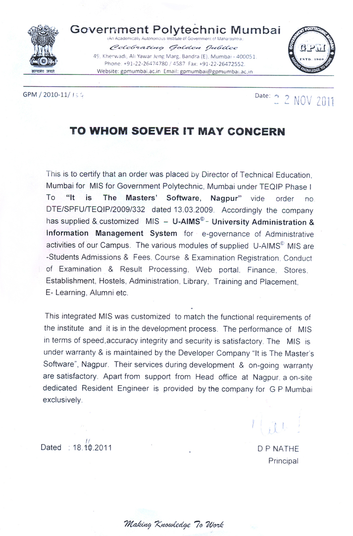 The integrated MIS was customized to match the functional requirements fo the institute. The performance of MIS in terms of speed accuracy, integrity & security is excellent. Apart from support from head office at Nagpur, an on-site dedicated Resident Engineer is provided by the company for G P Mumbai exclusively.