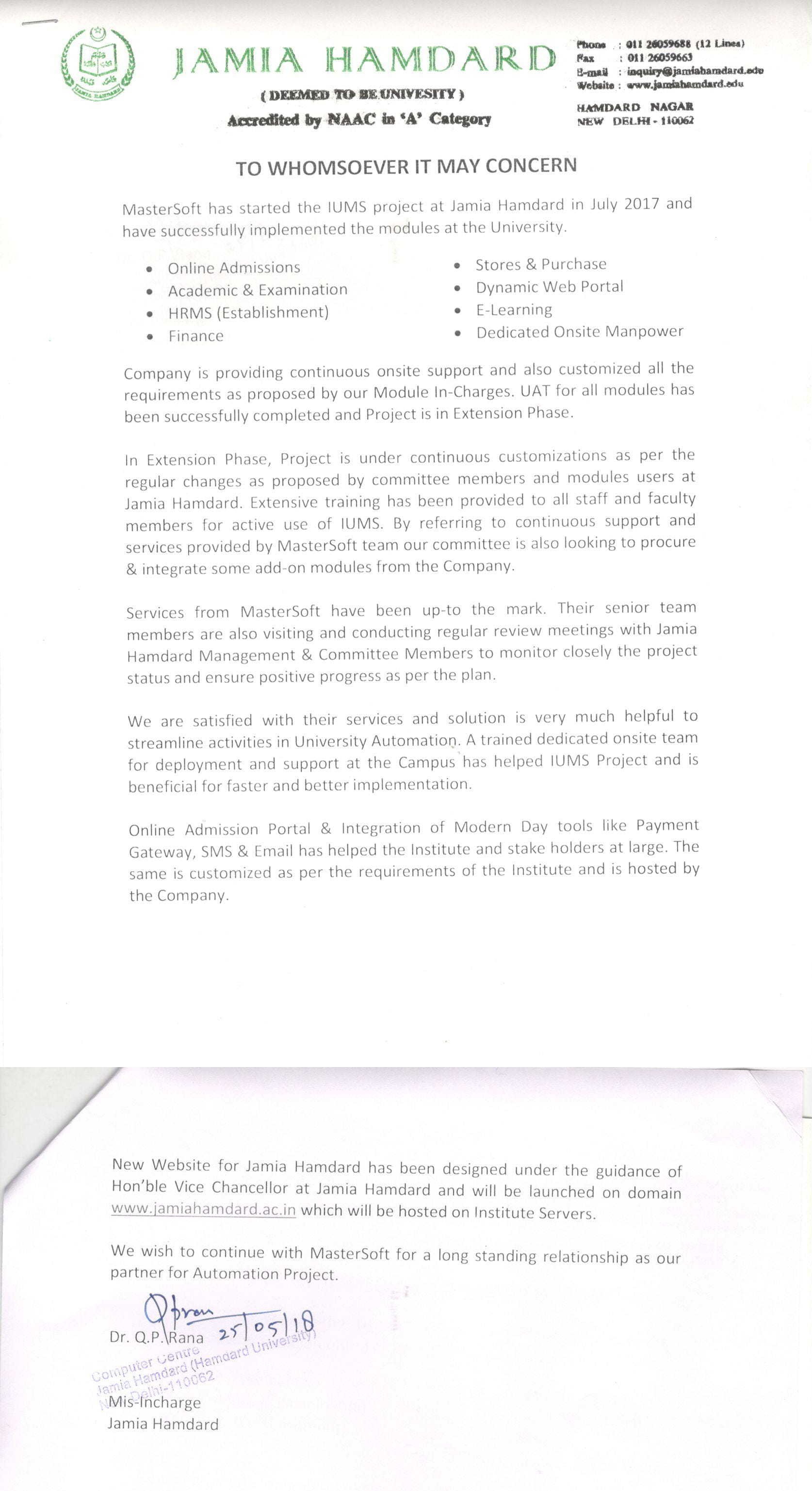 Services from MasterSoft have been up-to the mark. Their senior team members are also visiting and conducting regular review meetings with Jamia Hamdard management & committee members to monitor closely the project status and ensure positive progress as per the plan.