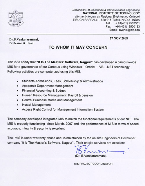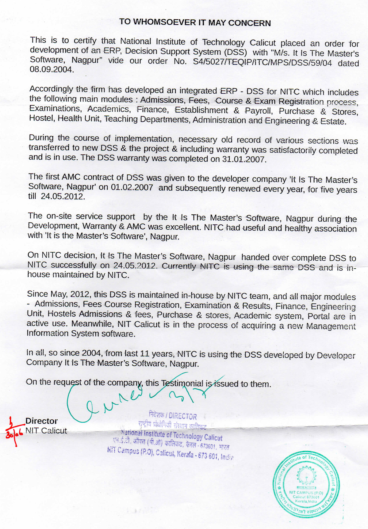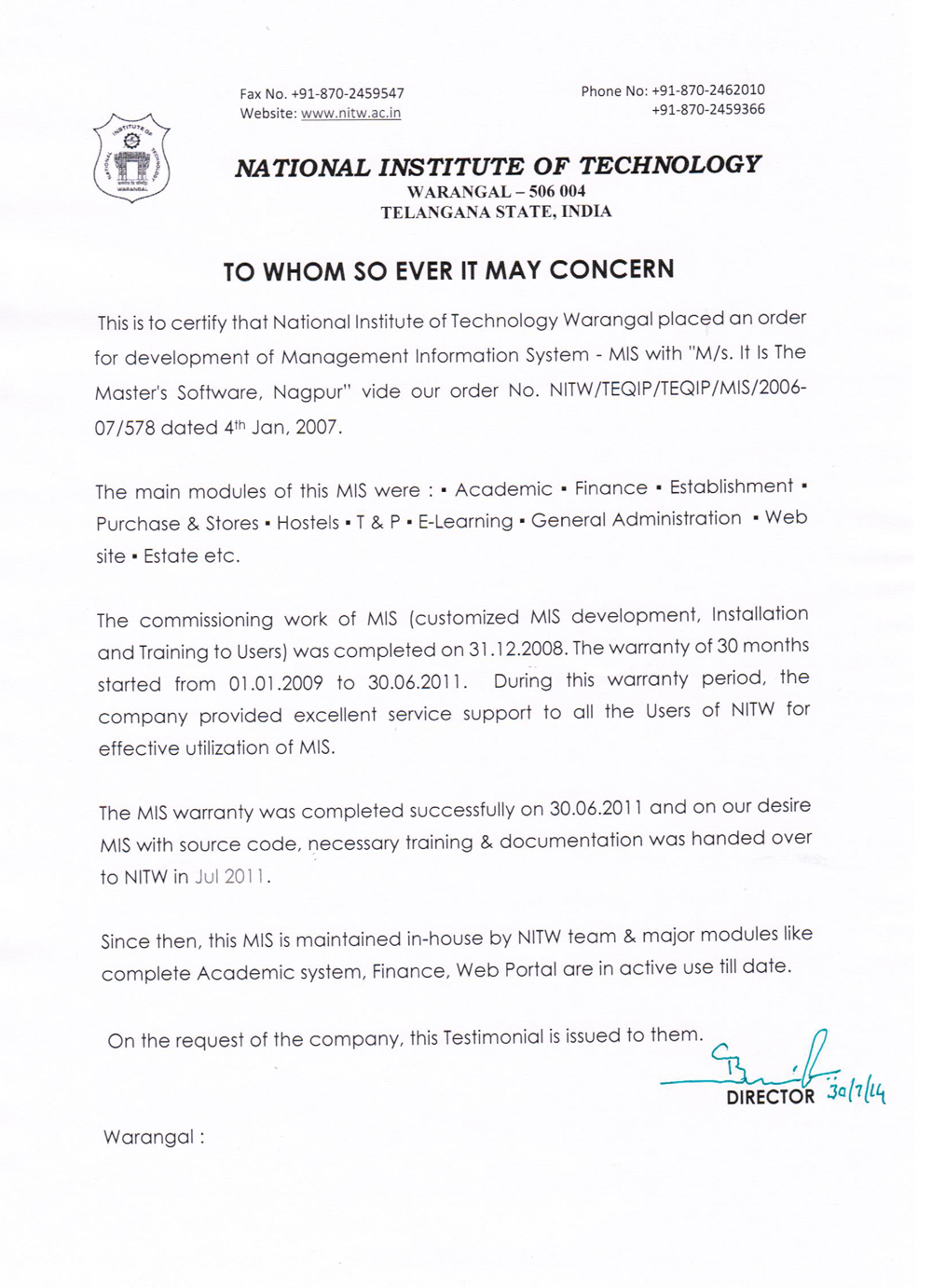 The company provided excellent service support to all the users of NITW for effective utilization of MIS. The MIS after the warranty period was successfully implemented and our desire MIS with source code, necessary training & documentation was handed over to NITW.