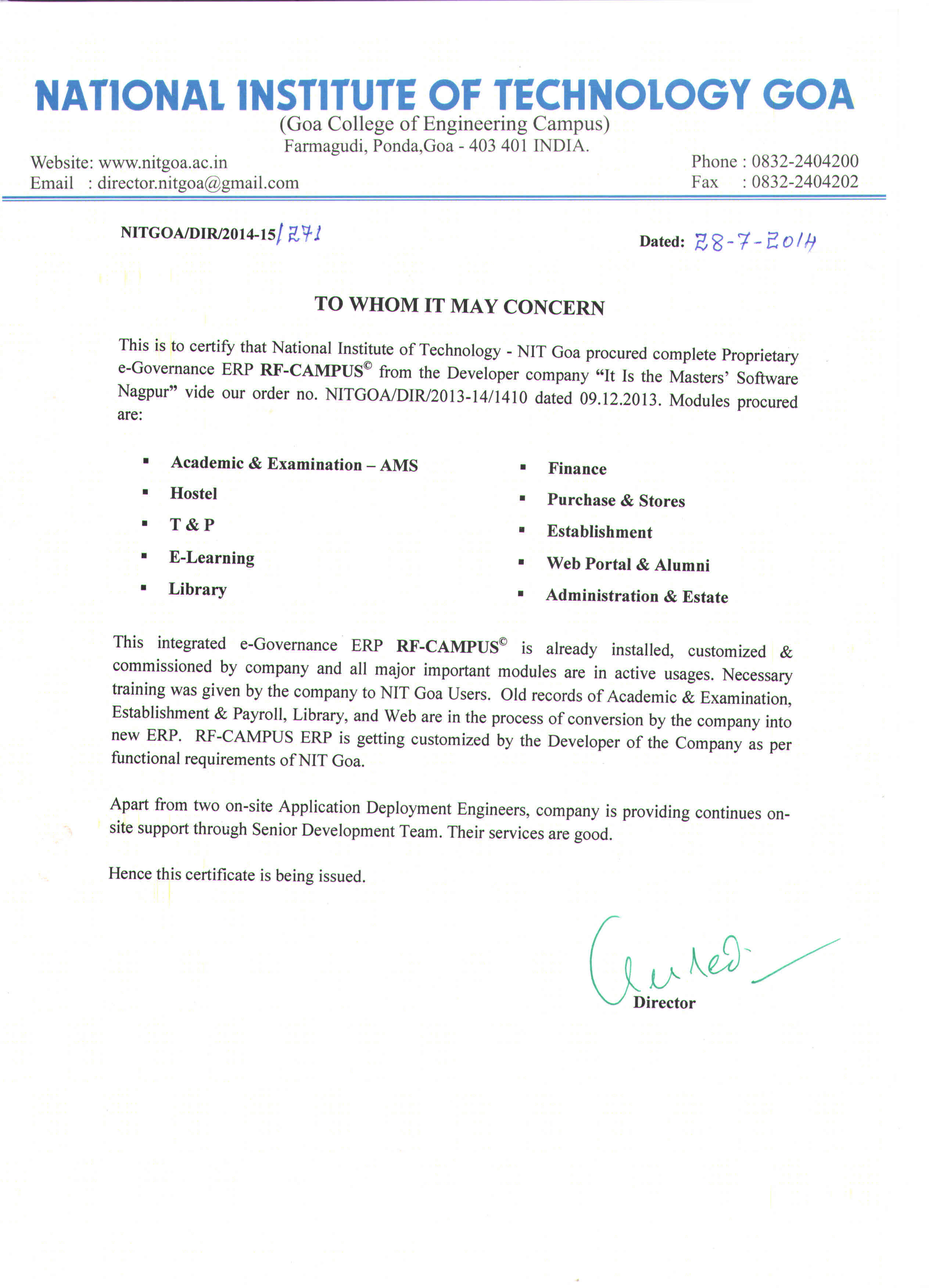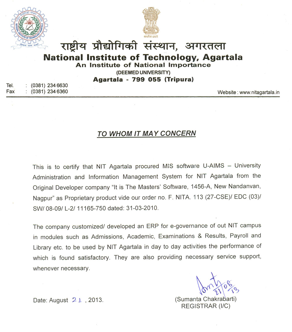 The company customized/developed ERP for e-governance of out NIT campus in modules such as admissions, academic, examinations & results, payroll and library etc. to be used by NIT Agartala in day to day activities the performance of which is found satisfactory. They are also providing necessary service support, whenever necessary.