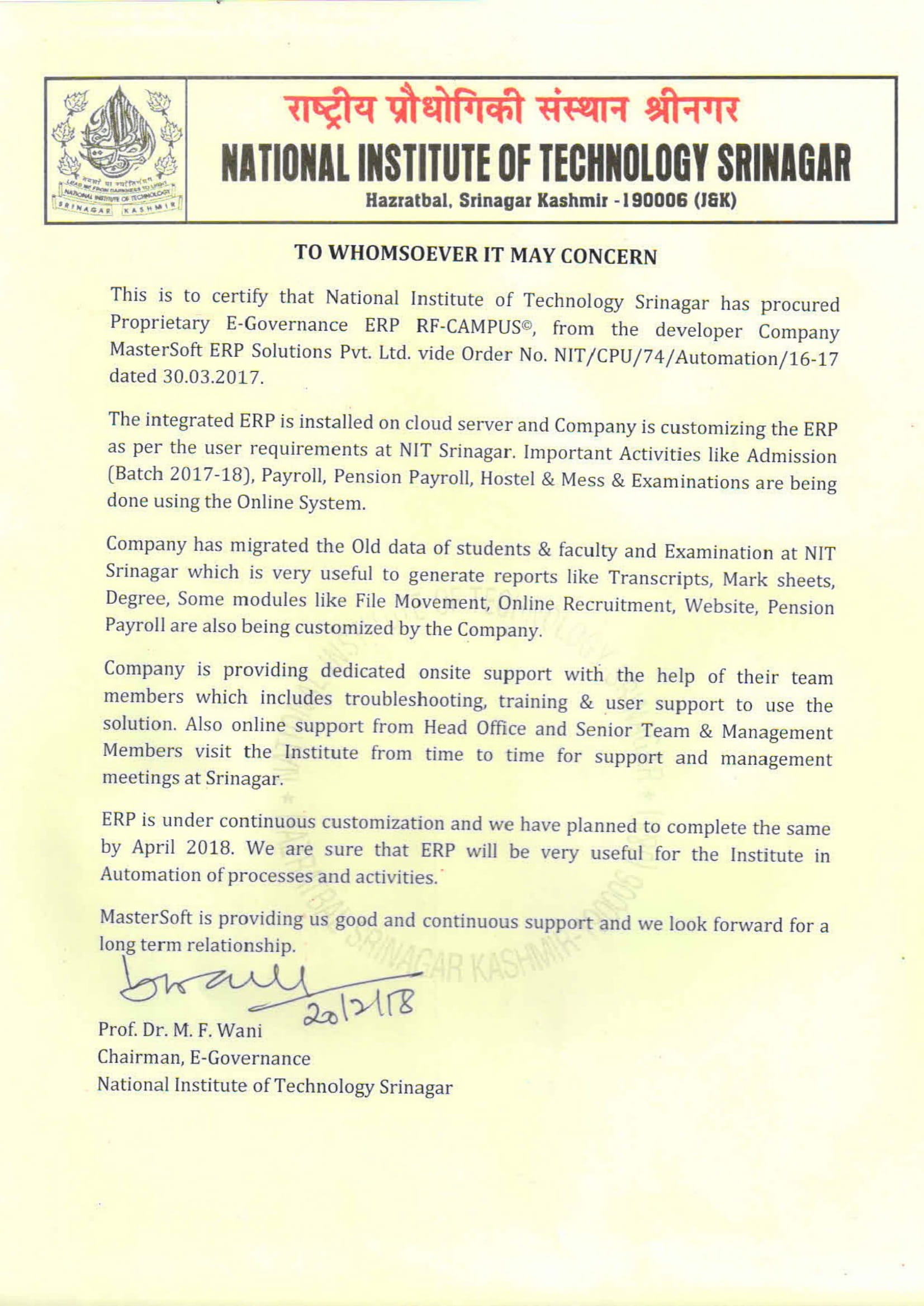 The e-Governance ERP RF-CAMPUS is customized & commissioned by company and all major important modules are in active usages. Old records of Academic & Examination, Establishment & Payroll, Library, and Web are in process of conversion by the company into new ERP. MasterSoft is providing continues on-site support with good services.